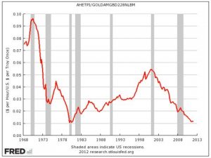 Here is the FRED rendition of average hourly earnings priced in gold (what fraction of an ounce of gold you can get for working one hour) as generated by BI: