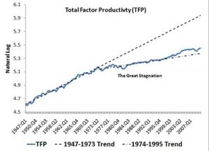 Only a willful and ideological Keynesian could ignore the salient detail: as soon as the USA left the gold exchange standard, total factor productivity began to dramatically stagnate.