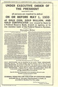 A particularly notorious part of FDR’s efforts to find a way to lift the Depression was an executive order requiring all, with very narrow limitations, under threat of prosecution, to turn in their gold holdings for currency. This occurred shortly prior to the revaluation of the dollar from $20.67/oz to, in stages, $35.