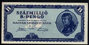 Easy though it is to think of 1923 as a uniquely terrible episode, though, the truth is that it was not. It was not even the worst of the 20th century; during its Hungarian equivalent, in 1945-46, prices doubled every 15 hours, and at the peak of this crisis, the Hungarian government was forced to announce the latest inflation rate via radio each morning–so workers could negotiate a new pay scale with their bosses—and issue the largest-denomination bank note ever to be legal tender: the 100 quintillion (1020) pengo note.